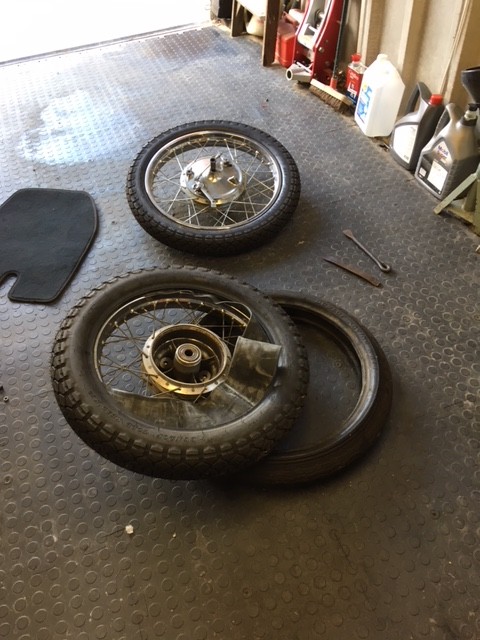 Next some tyre fitting. I got a bad back for my troubles, but we now have a new set of K81's on board. The orginal Japanese Dunlop rear tyre was made of / with rayon, apparently!