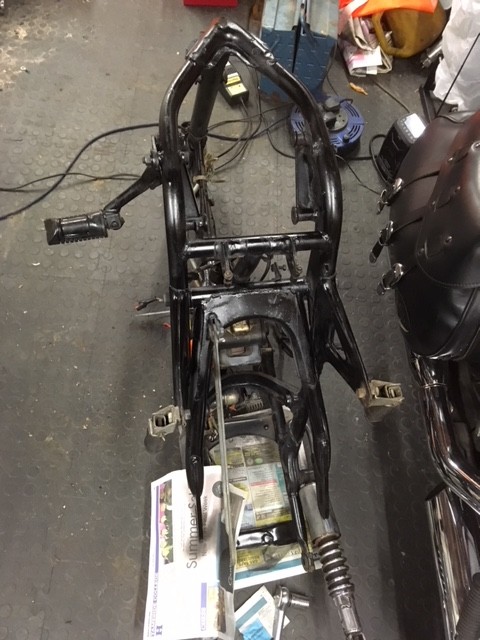 I turned the frame the right way up and tried to change the head bearings for taper rollers, so I could fit the yokes. The top race popped clean out after some heat and a few whacks, but unfortunately the lower race is stuck after not coming wanting to come out square, I'm going to look for a small cutting wheel I can put in my drill to cut a piece out, as I can't get my angle grinder in there. I managed to lump hammer my thumb, which turned blue, as did my language.