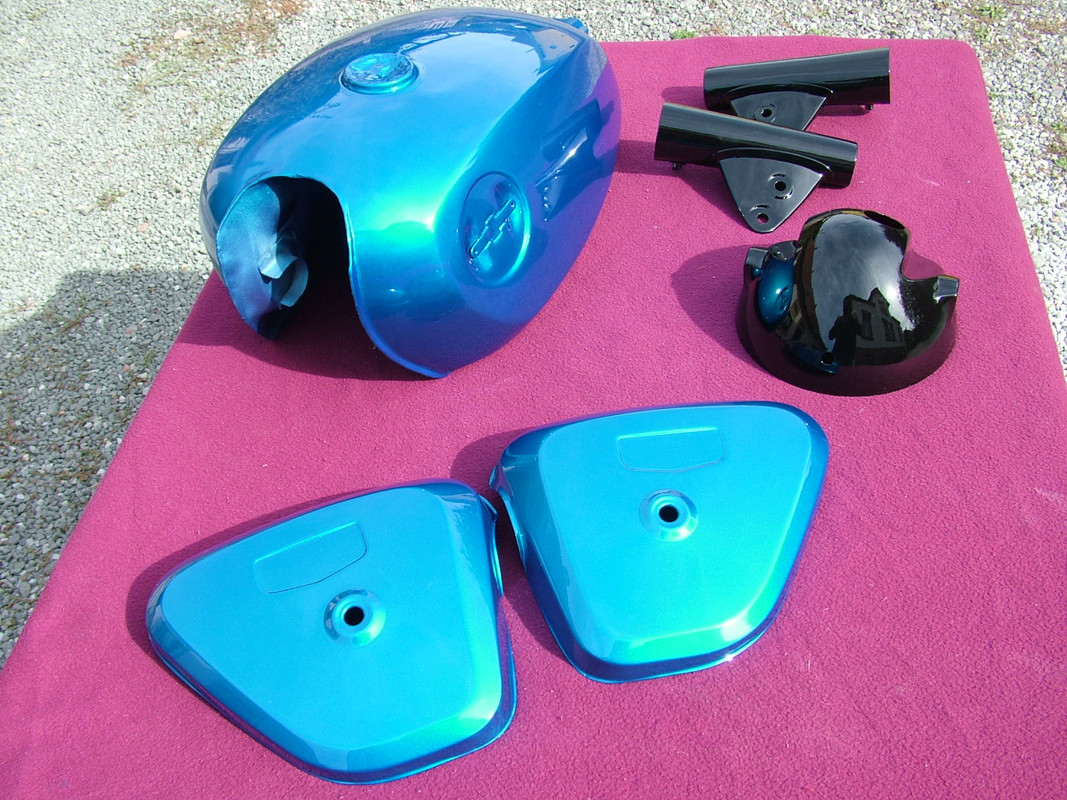 Menno has painted the tank and panels, and is now straightening the headlamp ears. Here's the bodywork after the acid bath: