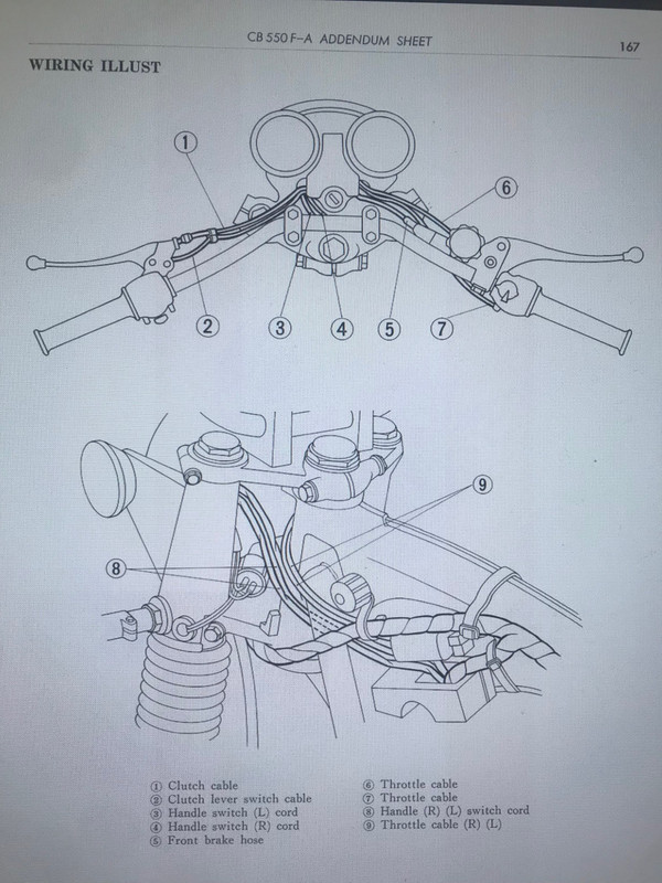 So over the fork top on the top yoke, through the gap in the speedo/tacho bracket, round to the left of the headstock, under/over the tank mount rubber (which is odd as one image shows it above and one below, see which looks right, I suspect below as it would bend the cables less) through the gap in the frame where the coils sit and onto the carb bracket.