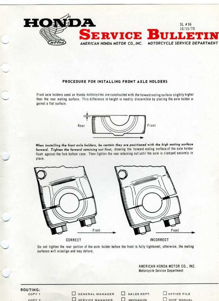 Do not doubt your knowledge, and will re-do my axles (750 & 400).... simply asking 'why' out of mechanical interest. If anything I can see a reason not to... ie the both the nuts & the mating surfaces (axle holder to lower fork) will not be square by tightening the leading nut first - leading to deformation and then loosening (of the fork axle bracket) due the relatively soft alloys?