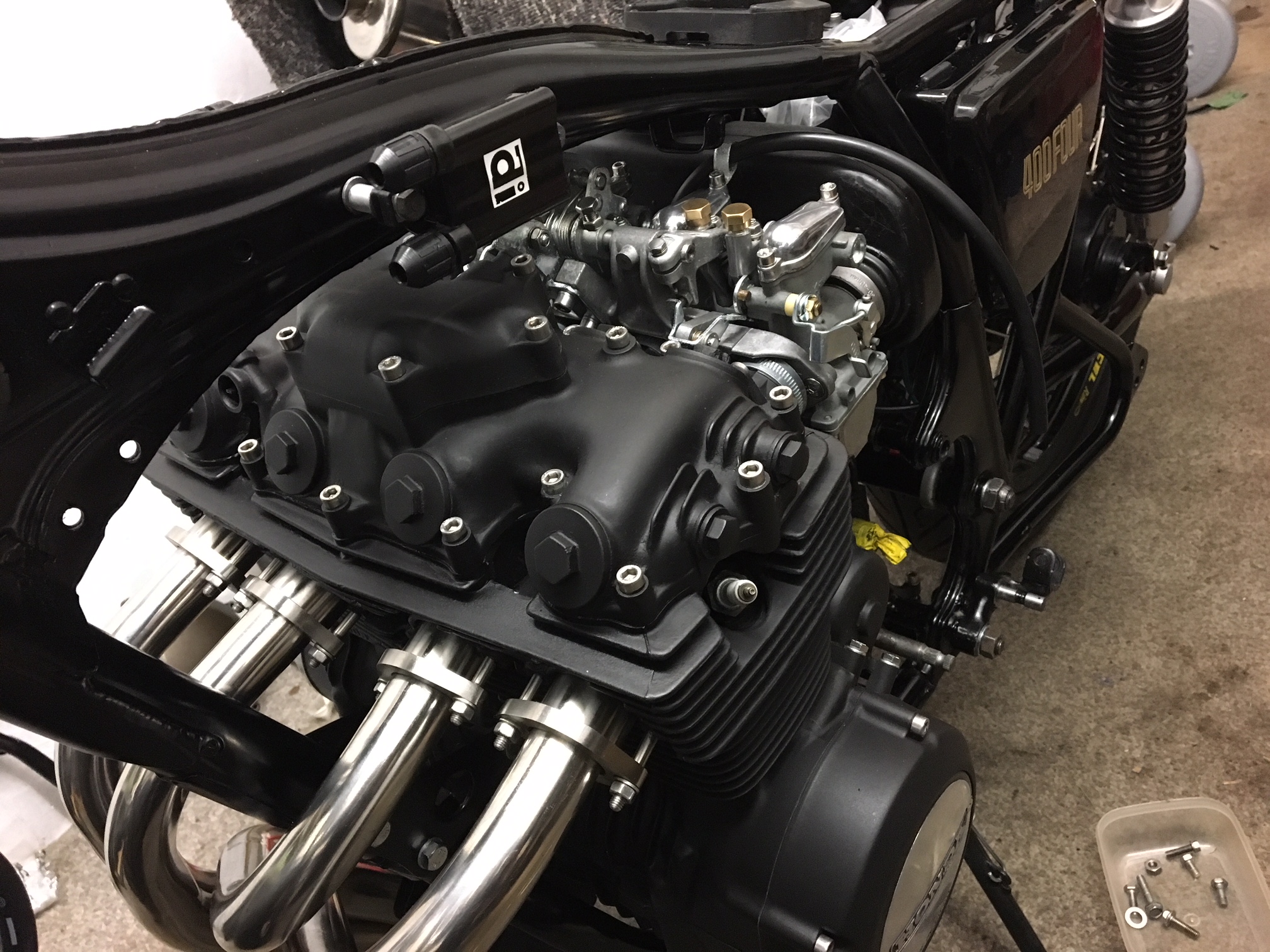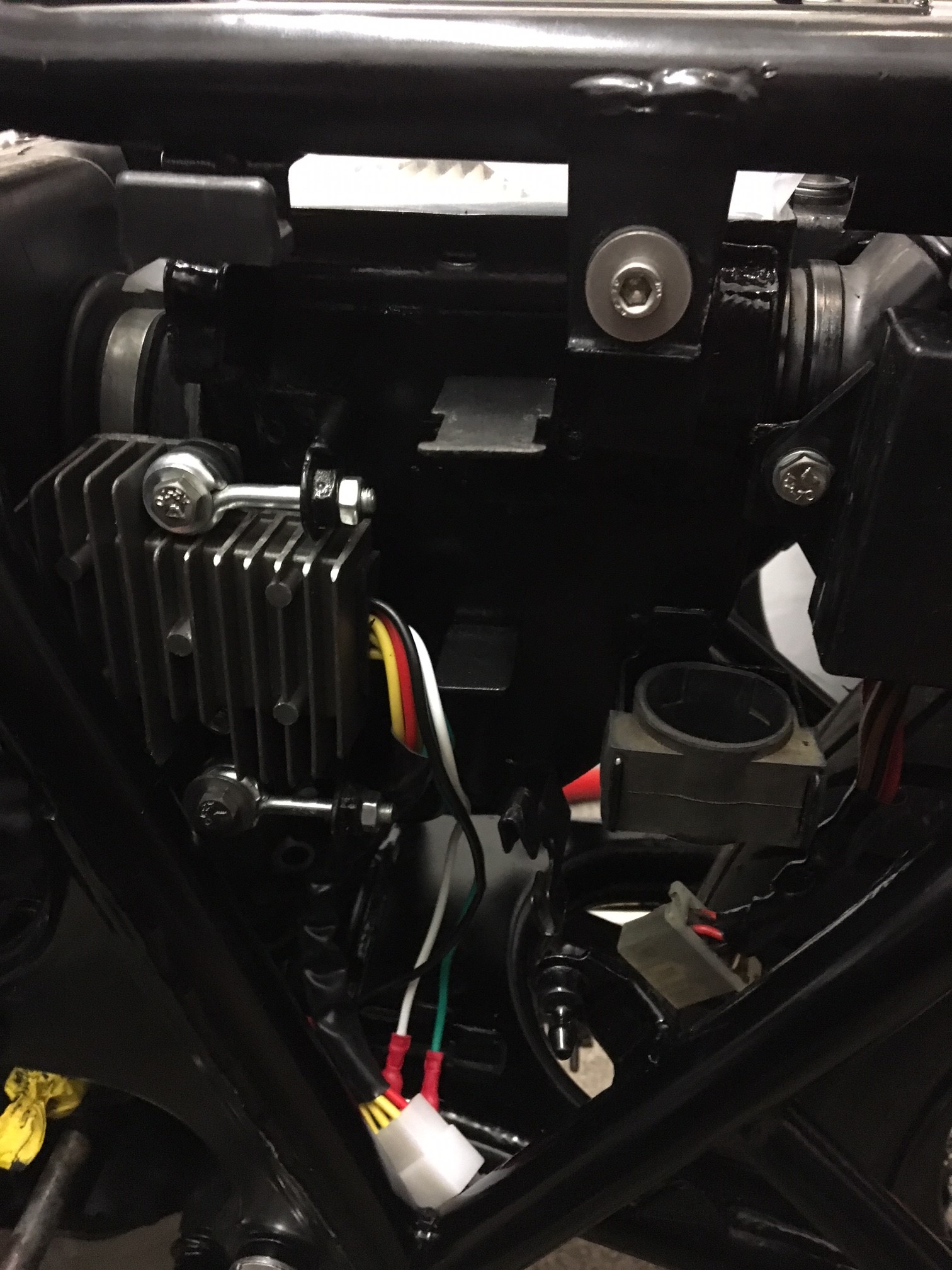 Delkevic exhaust now all fitted, carbs and airboxes in and I made a bracket for the rectifer/regulator which fits perfect.